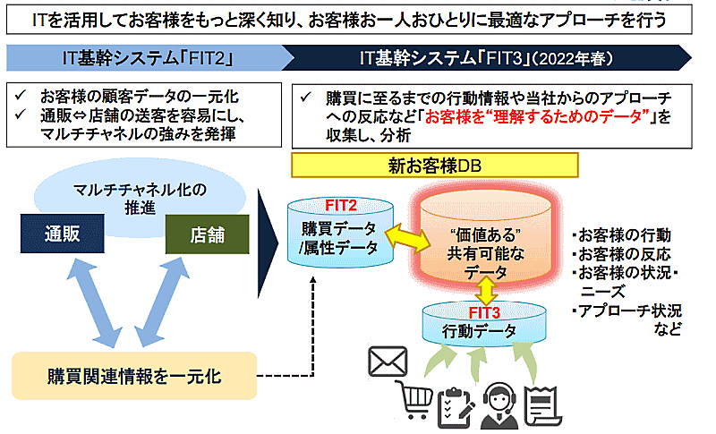 今後は、ITを活用して顧客を深く知り、顧客1人ひとりに対して最適なアプローチを行っていく。現状のIT基幹システム「FIT2」で通販と店舗の顧客データといった購買関連情報を一元化し、通販と店舗間の相互送客を容易にしてマルチチャネル化を推進する。