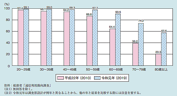 過去1年間にインターネットを利用したことがあるかを、年齢階級別に2019年と2010年を比較すると、80歳以上が37.2ポイント増と最も大きい。次いで70~79歳が35ポイント増、60~69歳が26.1ポイント増。インターネットを利用する60代以上の者が増加傾向にある。