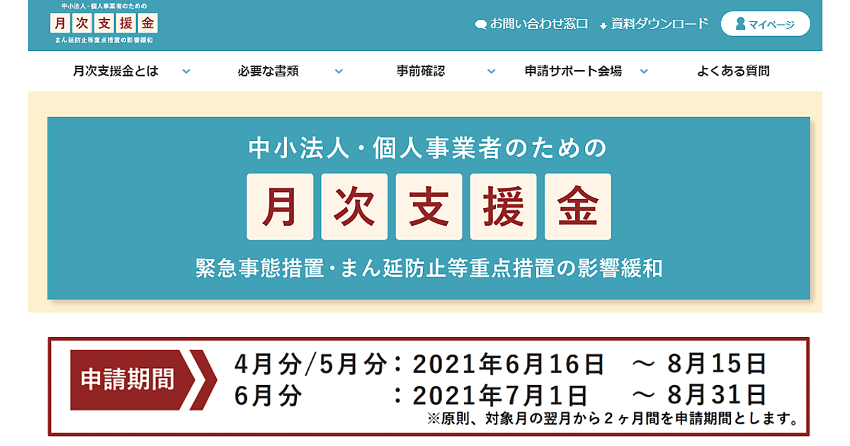 「緊急事態措置」「まん延防止等重点措置」による「飲食店の休業・時短営業」「外出自粛等」の影響で、売り上げが50%以上減少した中小法人などに月額上限20万円、個人事業主などに月額上限10万円を給付する「月次支援金」の申請受付が、6月16日(水)に始まった。