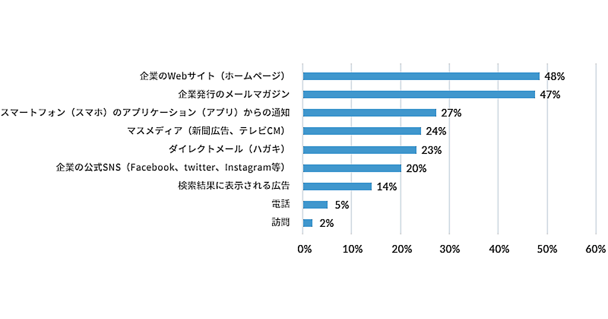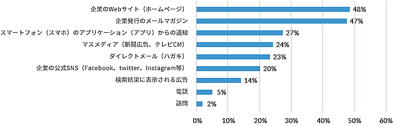 企業や団体のCRM運用支援を行うエイジアはが実施した「企業に求める情報発信とコミュニケーション方法」に関する調査結果によると、「企業から情報を受け取る最適な手段は何ですか」という質問(複数回答可)に対し、48%の人が「企業のWebサイト」、47%の人が「企業発行のメールマガジン」を選択した。