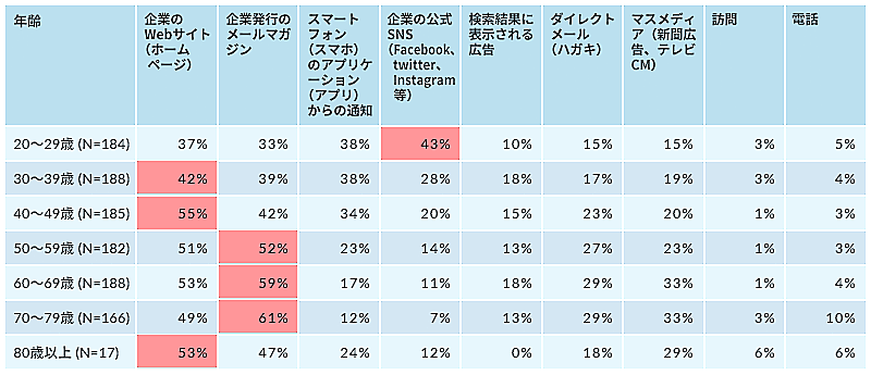 ソーシャルメディア(SNS)を最適な手段として選択した人は20%。回答結果を年齢別分布で比較したところ、20代は「企業の公式SNS」、次いで「企業のWebサイト」、「スマートフォン(スマホ)のアプリケーション(アプリ)からの通知」がほぼ同率で上位を占めている。