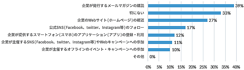 一方、年齢別の「特にない」以外の回答では、20代は「公式SNSのフォロー」が最も多く35%、30代も同様で31%。40代以降はメルマガが最も多い。