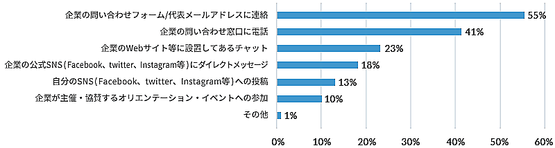 次いで、41%の人が「企業の問い合わせ窓口に電話」を選択、ダイレクトな対話を求めている方もいると考えられる。一方、「企業が主催するオリエンテーション・イベントへの参加」を選択した人は10%にとどまった。
