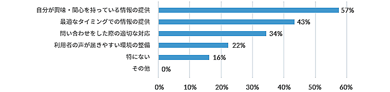「あなたが企業とのコミュニケーションに求めるもの」(複数回答)については、「自分が興味・関心を持っている情報の提供」が57%、次いで「最適なタイミングでの情報の提供」(43%)だった。消費者は、ターゲティングされた情報を最適なタイミングで発信するということを企業に求めている。