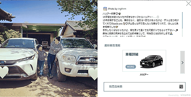 投稿をタップ(クリック)すると、モーダル画面が立ち上がり、投稿の詳細を見ることが可能。車種の詳細ページ、試乗予約、見積依頼、販売店検索ページにジャンプできる。