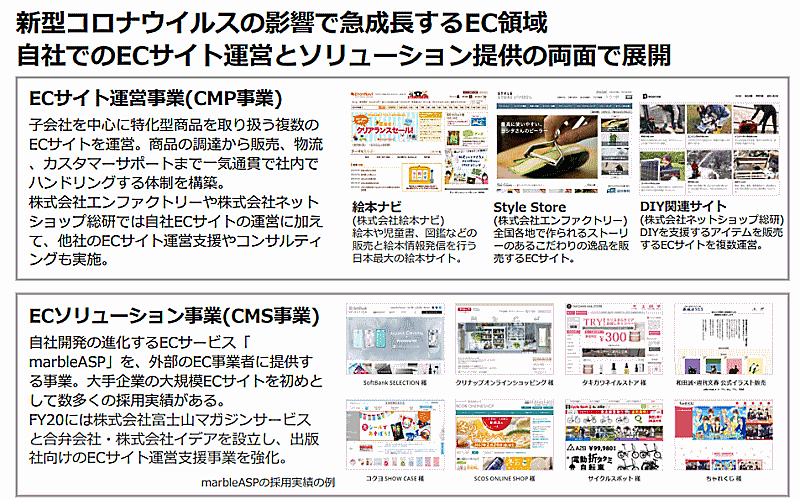 子会社のエンファクトリーではECサイト「スタイルストア」、絵本ナビでは絵本や関連グッズのオンライン販売を展開。ネットショップ総研によるECコンサルティングなどを手がける。