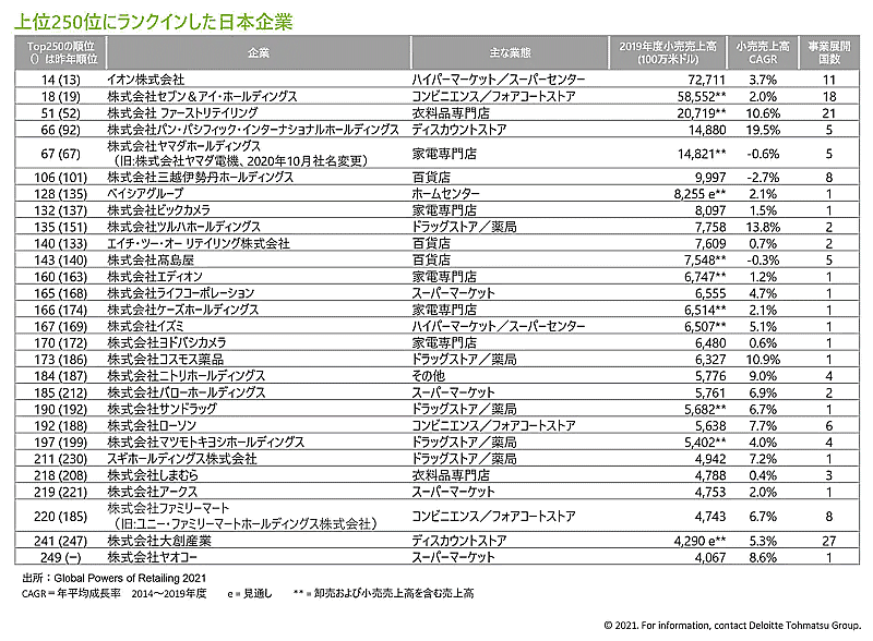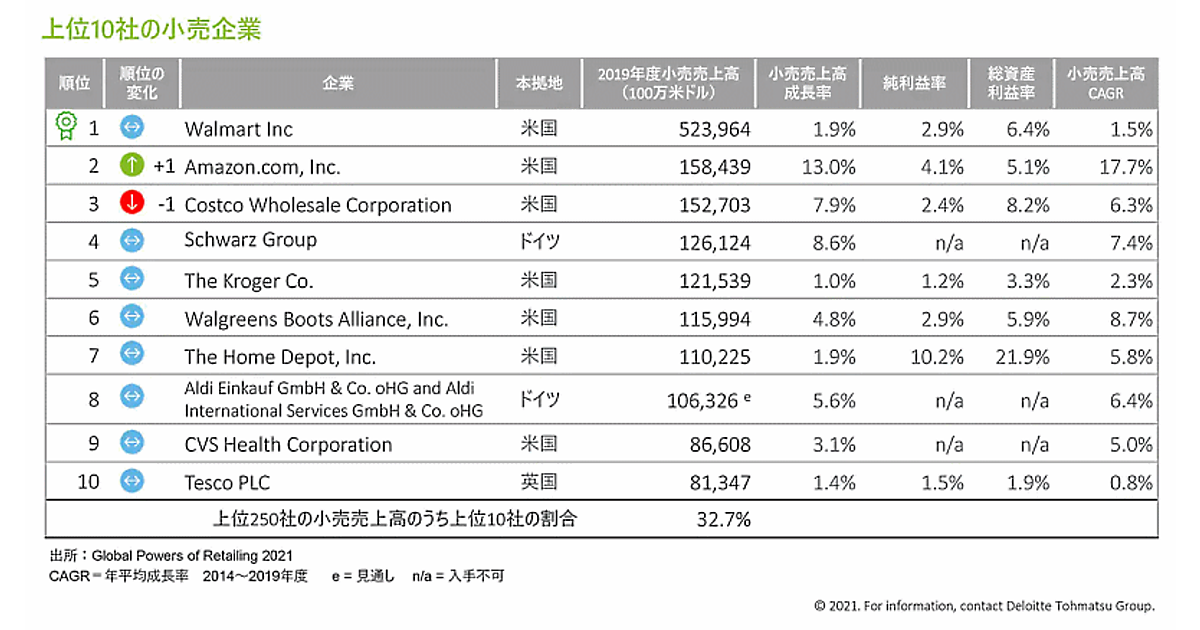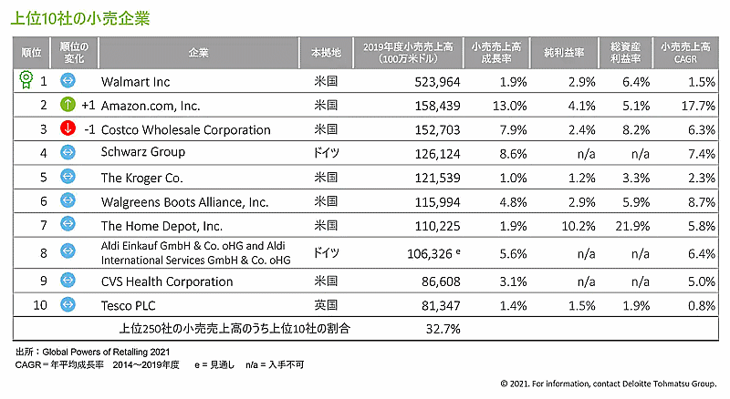 デロイト トーマツ グループは6月23日、「世界の小売業ランキング2021」を発表した。