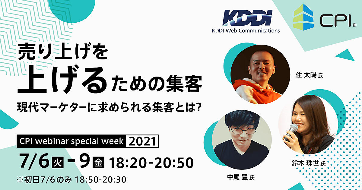 KDDIグループのCPIは7月6日(火)〜9日(金)の4日間、中小事業者における集客にフォーカスしたウェビナーを開催する。「SEO検索エンジン最適化」運営者の住 太陽(すみ もとはる)氏、PROPO代表取締役の中尾 豊氏、コミュニケーション・マーケティングコンサルタントの鈴木珠世氏が、SEO、LPO、アフィリエイト広告のプロとして登壇する。
