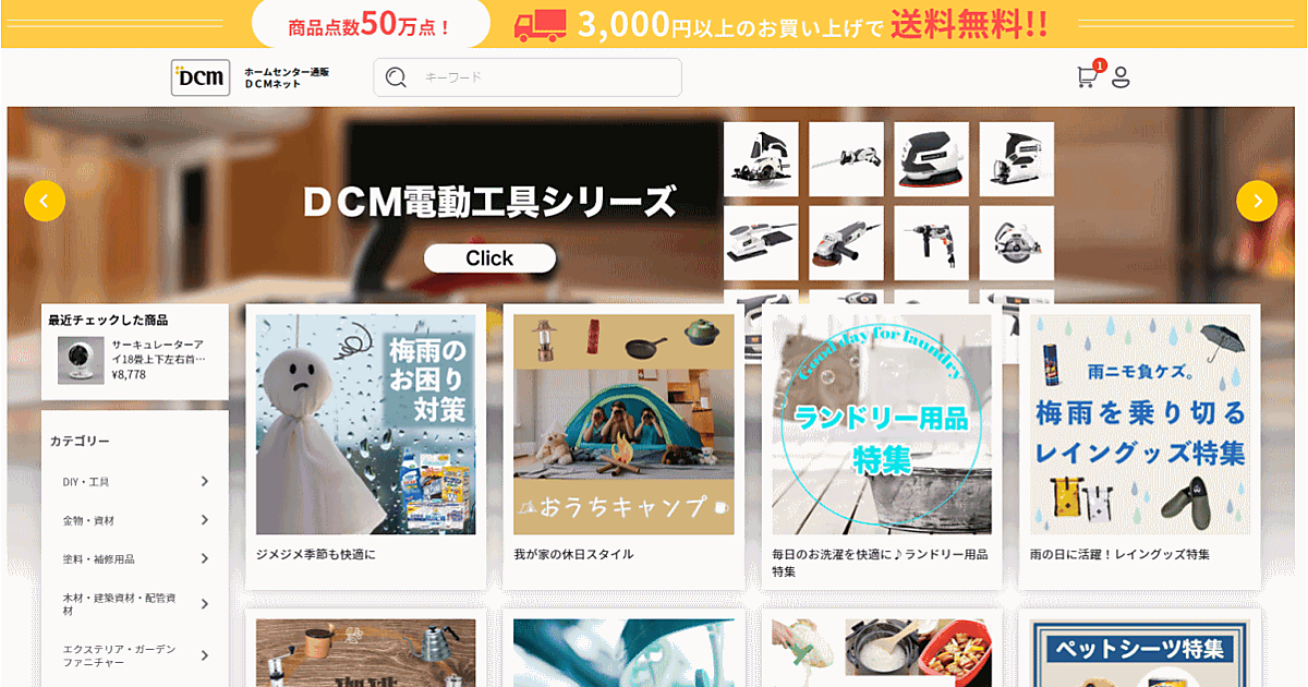 「DCMネット」は、ホームセンターの運営で培った商品選定と品ぞろえで約50万点の商品を扱う。商品の幅広い知識やノウハウをもとに、約1万3000の商品の利用シーン、ハウツー情報といったコンテンツを掲載し、商品購入につなげる。