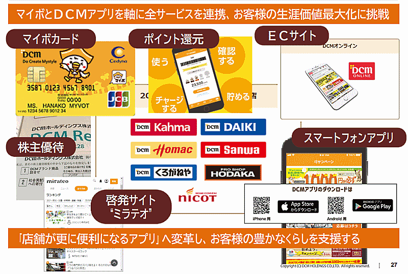 DCMグループ共通の会員サービス「マイボ」とDCMアプリを軸に、ECサイトや「ミラテオ」など全サービスを連携。「店舗がさらに便利になるアプリ」へ変革し、消費者の豊かな暮らしを支援するサービスへの進化をめざす。