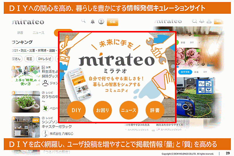 DCMはDIYと園芸に特化したキュレーションサイト「ミラテオ」を運営。DIYコンテンツ、ニュース、辞書などDIYへの関心を高め、暮らしを豊かにするための情報を発信している。「DCMネット」は「ミラテオ」と連携し、コンテンツ経由の商品購入を強化する。