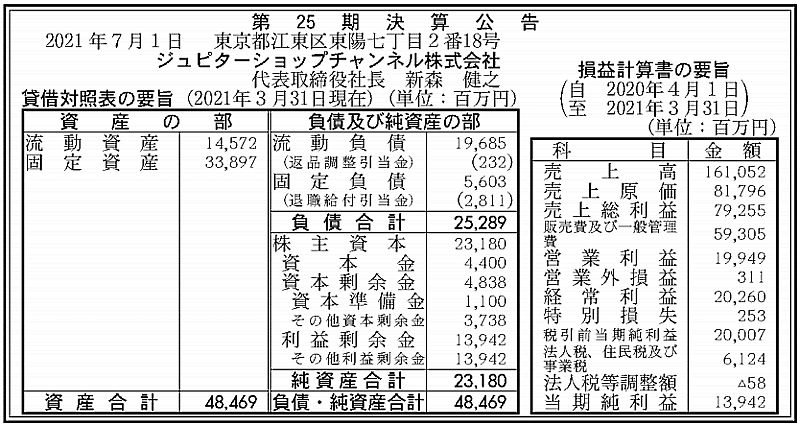 24時間365日生放送のショッピング専門チャンネル「ショップチャンネル」を運営するテレビ通販最大手ジュピターショップチャンネルの2020年度(2020年4月~2021年3月)売上高は前期比1.4%減の1610億5200万円だった。