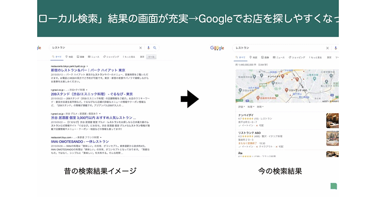 Googleで店舗の検索がしやすくなったのは、位置情報、場所+キーワードといった「ローカル検索」をGoogleが重視するようになったためです。