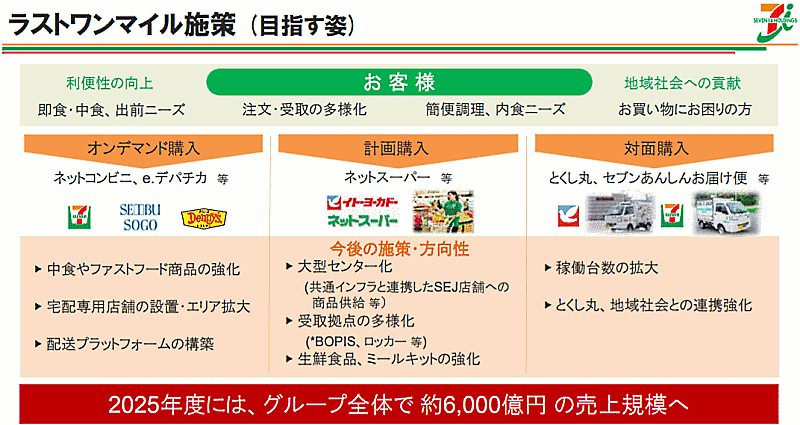 セブン&アイHDはグループで、コンビニで扱う商品をネット上で販売するECサービス「ネットコンビニ」、デパ地下グルメのデリバリーサービス「e.デパチカ」といったオンデマンド購入、ネットスーパー事業、移動スーパーの「とくし丸」、移動販売「セブンあんしんお届け便」などを展開している。