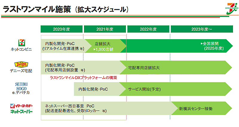 ラストワンマイル施策のロードマップとして、ネットコンビニは2021年度、1000店舗から開始し、2025年度には全国展開に拡大。デニーズによる宅配は2022年度初頭にも宅配専用店舗を拡大。そごう・西武による「e.デパチカ」は2022年度からサービスを開始する。