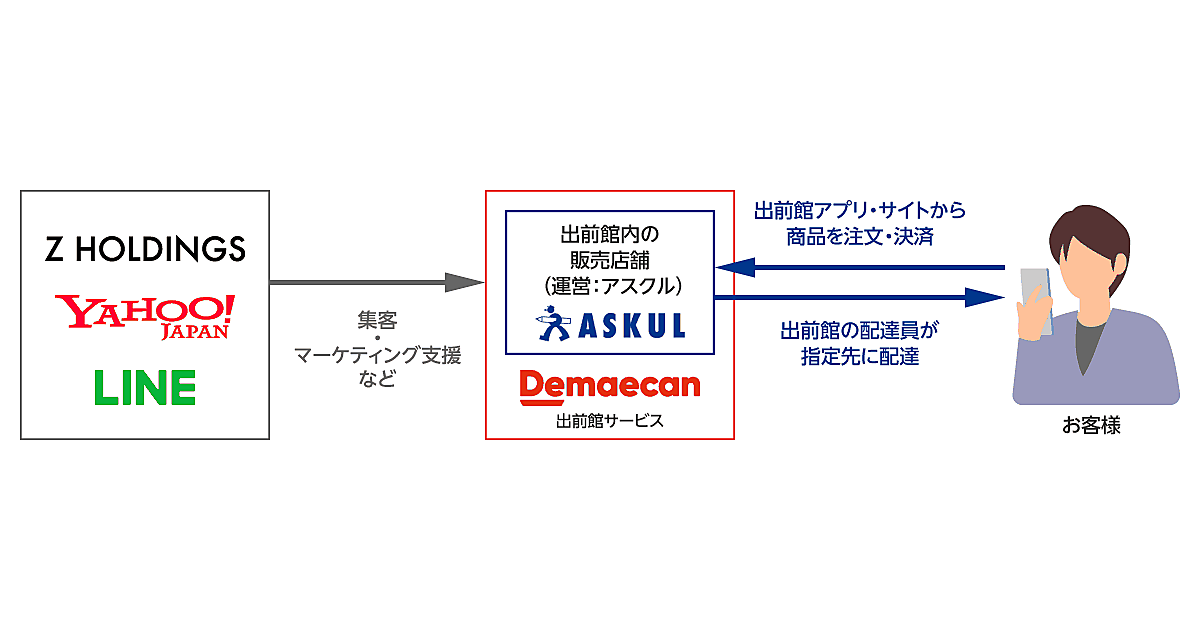 出前館の配達員は注文を受けた後、都内の専用倉庫で商品を受け取り、自転車やバイクで指定配達先に商品を届ける。ZHD、ヤフー、LINEは集客やポイント施策などのマーケティング活動をサポートする。