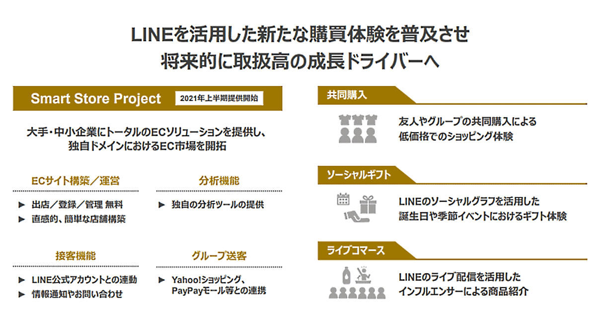 ヤフー親会社のZホールディングスとLINEは2021年3月に経営統合した。ZHDはLINE、「Yahoo!」、PayPayといった3つの起点からサービスの相互利用を促して経済圏を拡大。LINE公式アカウントの活用を進め、ライブコマース、ソーシャルギフトといった新しい価値を提供する取り組みを進める方針を掲げている。
