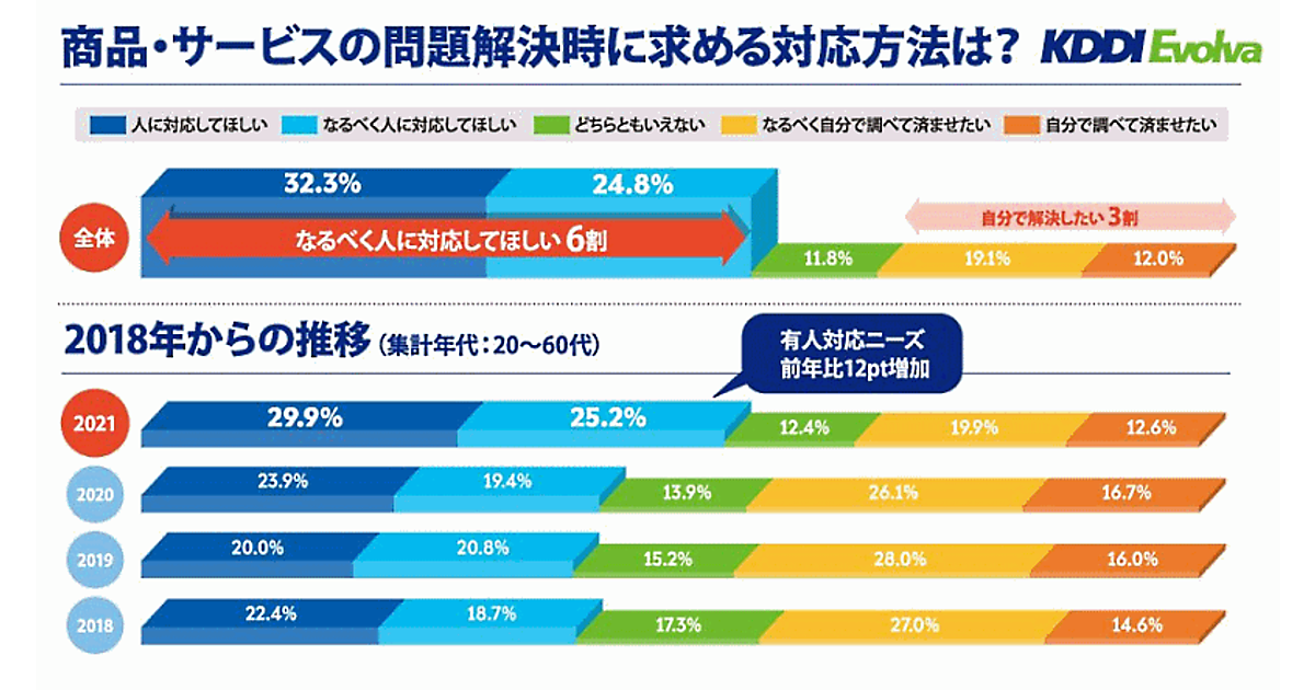 KDDIエボルバが公表した「企業とお客さまとのコミュニケーション実態2021」によると、商品・サービスの問題解決に関する問い合わせについて、「人による対応」を望む人が約6割にのぼっている。