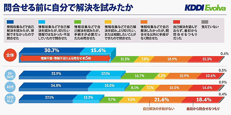 「問い合わせの前に自分で解決を試みたか?」の問いでは「試みた」の合計が約7割。また、約5割が「理解ができなかった」「知りたい情報がなかった」ことを理由に問い合わせに進んでいることから、WebサイトFAQの改善・拡充などにより、問い合わせ数削減を見込めることが推察される。