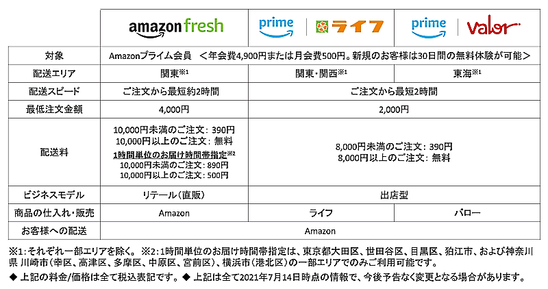 Amazonはプライム会員向けサービスとして「Amazonフレッシュ」の他に、食品スーパー ライフとの協業で、東京・神奈川・埼玉・千葉・大阪・京都・兵庫の一部エリアにおいてライフのストアを、スーパーマーケットバローとの協業により愛知県の一部エリアでバローのストアを展開している。対象エリアのプライム会員顧客は、それぞれのストアをAmazon.co.jp上で利用できる。