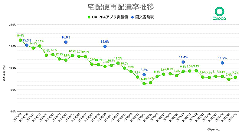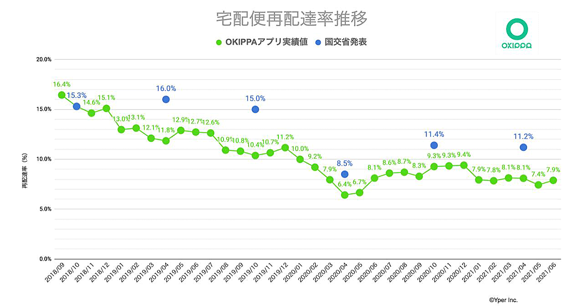 Yperでは2018年9月のOKIPPAバッグ発売以降、OKIPPAアプリ利用者の再配達率を毎月調査している。2020年4月は、都市部での緊急事態宣言下による在宅率の上昇などの特殊要因で再配達率は6.4%まで低下したが、2021年6月時点では7.9%だった。