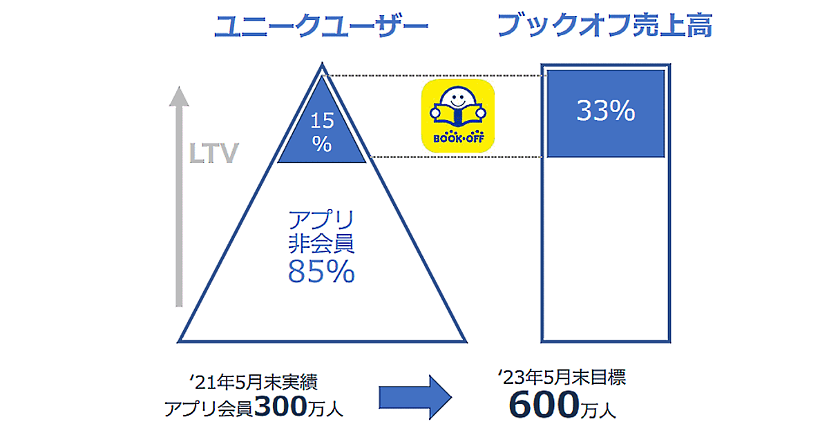ブックオフグループホールディングスは、主力のBOOKOFF事業においてアプリ会員300万人(2021年5月末時点)を2023年5月末に600万人へ拡大、ブックオフ利用客のうち15%のアプリ会員で売上高の3分の1を占める状態をめざすアプリ戦略を掲げている。