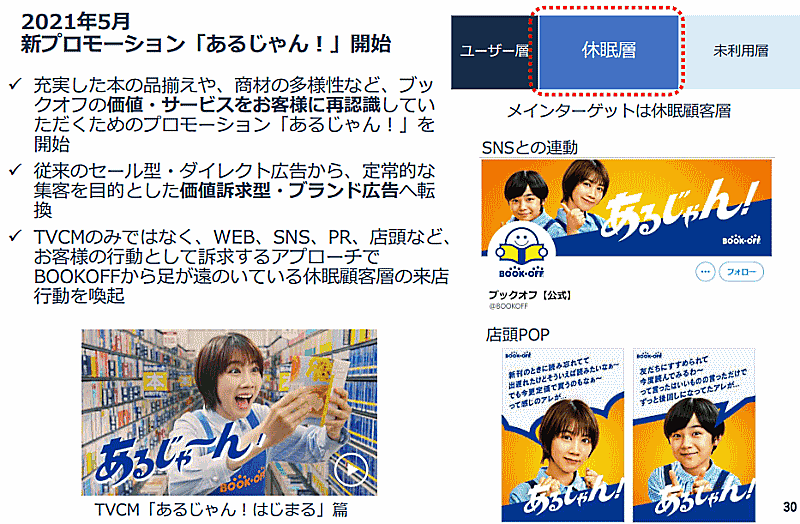 「売上1/3を15%のアプリ会員が生む」アプリ戦略の実現には、アプリを利用するユーザー層の拡大も重要になる。マーケティング戦略では定常的な集客を目的とした価値訴求型・ブランド広告へ転換。テレビCM、Web、SNS、PR、店頭など、顧客の行動として訴求するアプローチで「BOOKOFF」から足が遠のいている休眠顧客層の来店行動を喚起する。