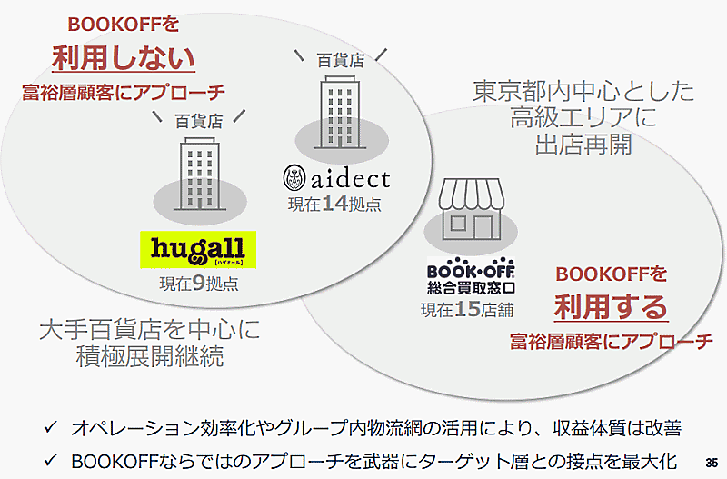 富裕層を対象としたリユース市場の拡大も推進する。大手百貨店9店舗に出店している富裕層向けの店舗「ハグオール」、百貨店・商業施設の14店舗に出店している「アイデクト」は積極展開を継続。現在15店舗を出店している総合買取窓口は、都内を中心とした高級エリアに出店を再開する。