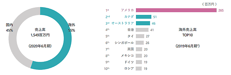 ホビーサーチの2020年6月期業績は、売上高が前期比6.4%増の15億4900万円、営業利益は同61.8%増の5500万円。海外販売に強く、北米を中心とした海外への売上高は全体の半数以上を占める。