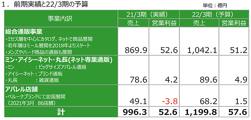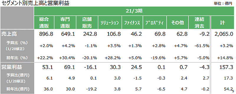 主力の総合通販事業では、雑貨類やホームウエアを中心に、巣ごもり消費などの通販需要が高まったことに加え、積極的な広告展開により、売上高は同22.2%増の896億7500万円、セグメント利益は同3.1倍の53億900万円と好調に推移した。紙媒体が好調だったことに加え、ネットシフトが進んだ。新規獲得効率が大幅に改善したほか、原価率低減と在庫回転数改善に成果が出ている。