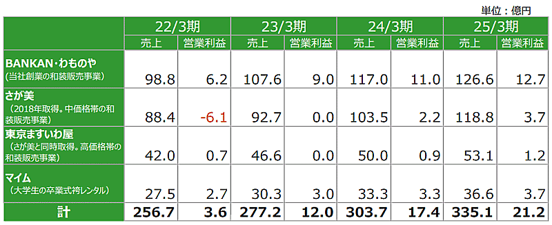 同社25年3月期の連結業績は、売上高3100億円、営業利益280億円を目指している。このうち、呉服関連事業の売上高は335億1000万円、営業利益は21億2000万円を見込んでおり、大きなウエイトを占める。