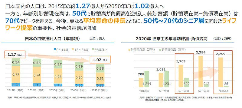 日本国内の人口は、2015年の約1億2700万人から2050年には1億200万人に減少。年齢別貯蓄現在高は、50代で貯蓄高が負債高を逆転し、純貯蓄額(貯蓄現在高-負債現在高)は70代でピークを迎える。今後、さらなる平均寿命の伸長とともに、50~70代のシニア層に向けたライフワーク提案の重要性や社会的意義は増加していく見る。