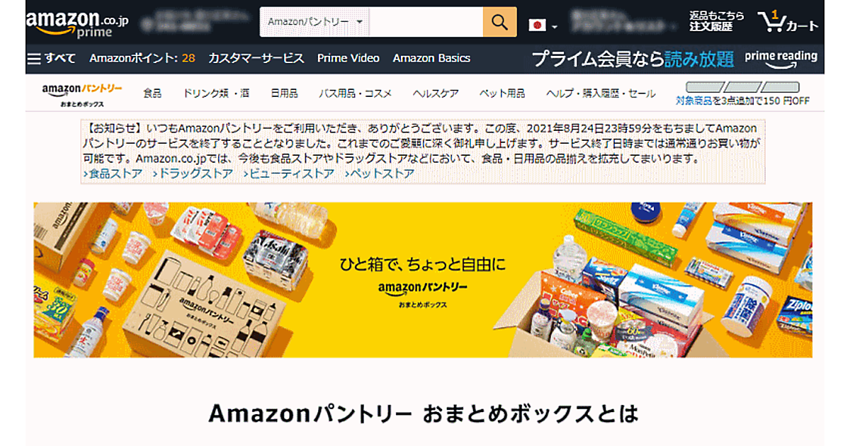 Amazonは、食品・日用品などを必要な分だけ購入できる「Amazonパントリー」を8月24日に終了する。