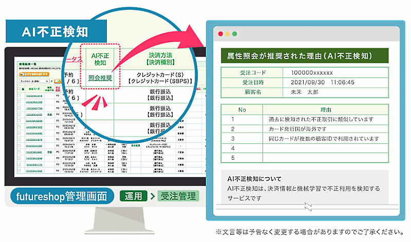 「futureshop」導入企業で、SBペイメントサービスの「オンライン決済サービス」を使う事業者は、ECサイトの不正対策として不正検知サービス「AI不正検知 for futureshop」を利用できるようになる。