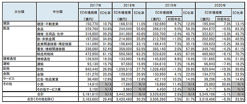「食料品製造業」の総売上高について、2020年は41兆8353億円で2019年比6.7%減。総売上高の減少に伴いBtoB-EC市場規模は26兆4672億円で同0.5%減となった。外出自粛の広がりで、消費者による外食やホテル利用が減少、業務用食品市場規模などが縮小し、商取引市場規模が減少した。