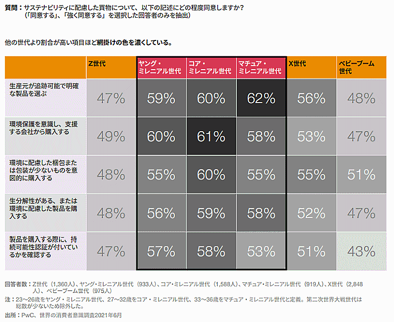 調査結果を詳しく分析すると、マチュア・ミレニアム世代(33~36歳)の「生産元が追跡可能で明確な製品を選ぶ」と、コア・ミレニアム世代(27~32歳)の「環境保護を意識し、支援する会社から購入する」が、ほぼ同じ割合。一部例外はあるが、ミレニアム世代を中心に若者世代の環境意識は高まりつつある。