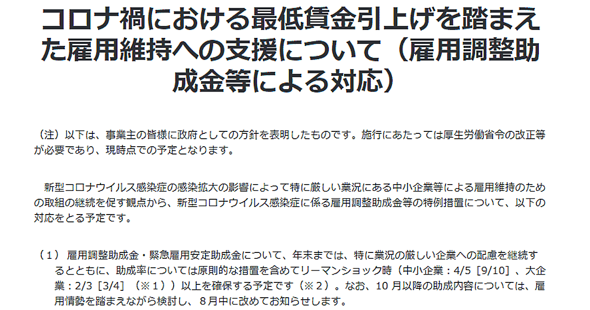 10月から最低賃金引き上げが実施されるため、雇用維持の観点から9月末までとしていた現行の「雇用調整助成金」特例措置を延長する