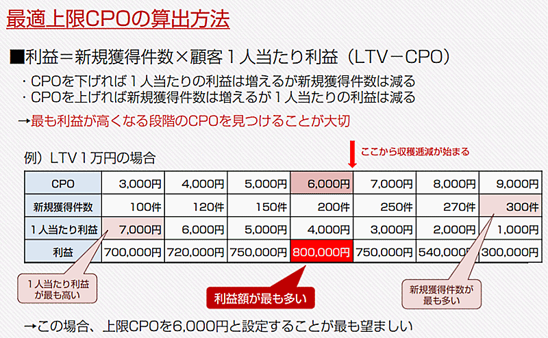 たとえば、下の表のようにLTVが1万円の場合、CPOが3000円であれば1人あたりの利益は7000円と最も高いが、新規獲得件数は100件にとどまるため、利益額は7000円×100件=70万円となる。このように計算していくと、CPOを上げれば利益額も一定までは上がっていくものの、CPOが6000円から7000円に上がった時点で利益額が落ち始める。この現象は「収穫逓減の法則」と言い、下の表の場合では収穫逓減が始まる直前のCPO6000円が、最適な上限CPOとなることがわかる。
