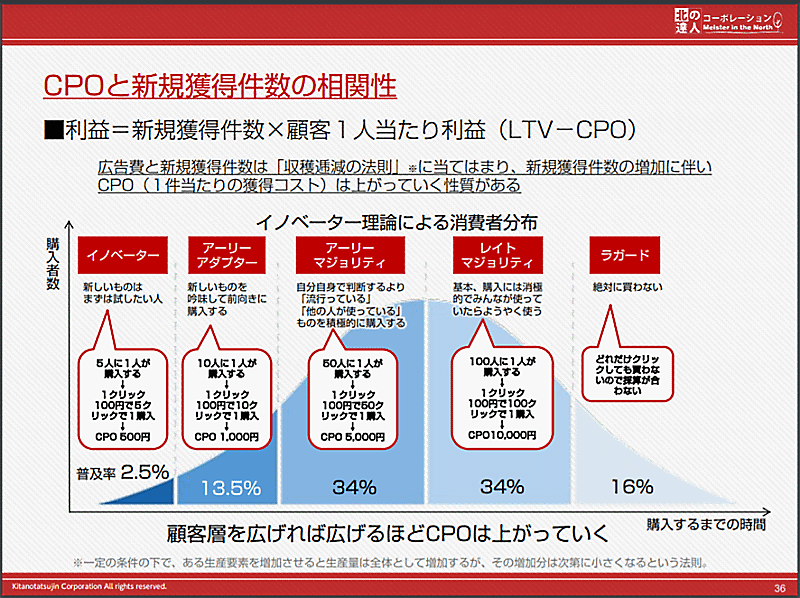 イノベーター理論の数値をCPOに置き換えると、下の図のようにターゲット層への普及率がイノベーター2.5%+アーリーアダプター13.5%=16%を超えると、CPOが急激に高くなっている。CPOを上げ続けながら売り上げを拡大すると利益が下がってしまうため、広告媒体や訴求方法を変えながら最適なCPOを維持しなければならないということだ。