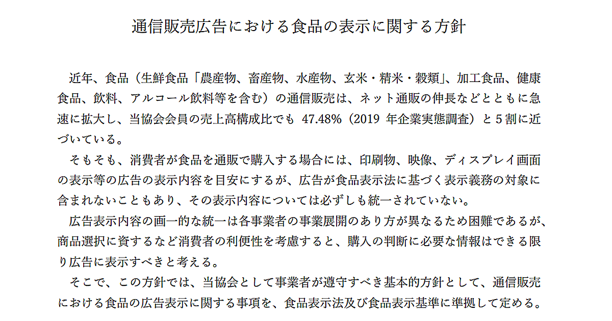 方針は、食品の通販広告に関する業界団体の自主的な基準として作成。食品の容器包装に関する表示事項を定める食品表示法および食品表示基準の内容を参考に、消費者ニーズや通販事業としての実現可能性を考慮した。