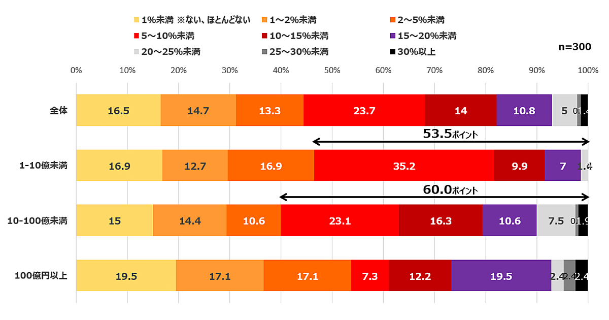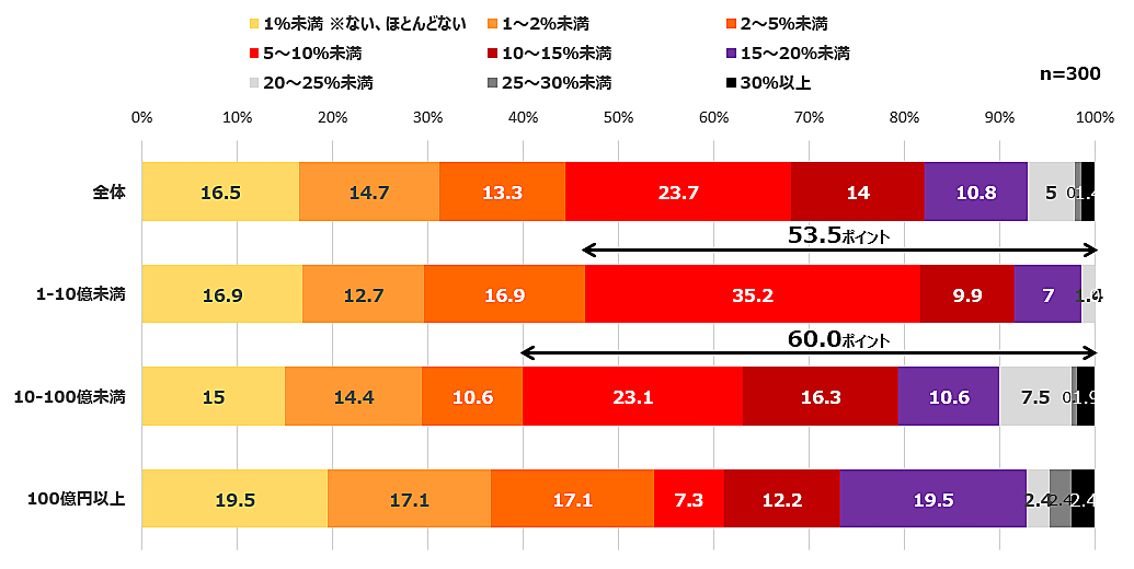 年商100億円以上では、5%未満との回答が5割(53.7ポイント)を超えており、1億-10億円未満、10億-100億円未満の事業者に比べて返品を抑え込んでいる。