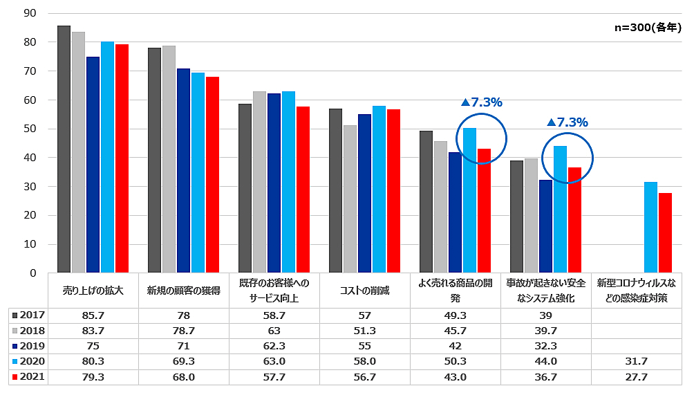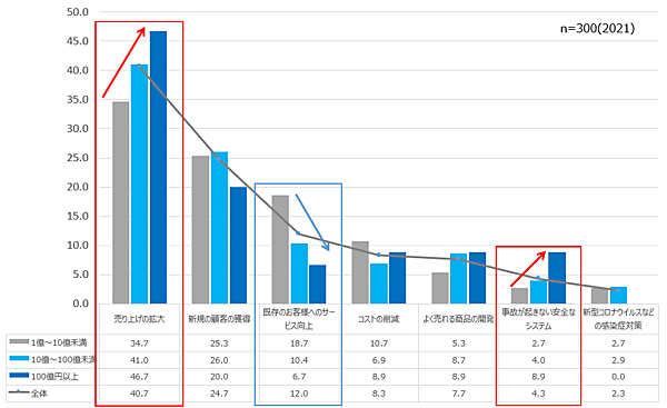 同じ質問項目を3段階の年商別で集計したところ、「売り上げの拡大」「事故が起きない安全なシステム」の2項目に関して年商が増えるほどスコアが上昇。逆に「既存のお客様へのサービス向上」は低下した。