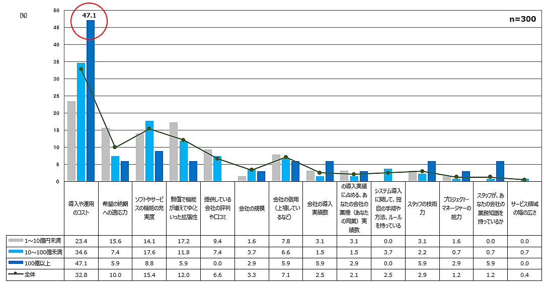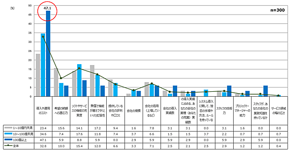 ただ、企業規模によって「導入や運用のコスト」への意識の違いが大きい。年商100億円以上の事業者では約半数に迫るが、年商1億-10億円未満では23.4ポイントにとどまっている。