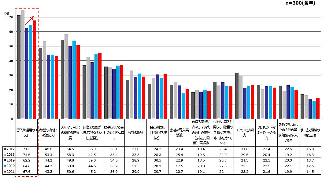 「通販の販売管理システム、ECシステム(パッケージ、クラウド、ASPなど)」導入時の際、システム比較の検討について聞いたところ(3段階の年商別で集計)、「導入や運用のコスト」項目のスコアが上昇している。