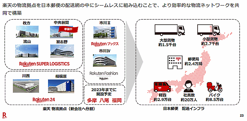 新設した完全子会社「JP楽天ロジスティクス合同会社」に、物流事業に関する権利義務を簡易吸収分割の形式で承継。7月1日に楽天グループ、日本郵便が「JP楽天ロジスティクス合同会社」に出資し、翌日に商号変更した「JP楽天ロジスティクス株式会社」がスタートした。