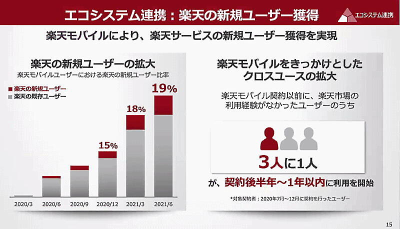 まずは新規ユーザー。2021年4-6月期に契約した楽天モバイルユーザーの新規ユーザーのうち、楽天のサービスを初めて使う新規ユーザーは19%。楽天モバイル契約以前に「楽天市場」の利用経験がなかったユーザーの3人に1人が、契約後半年から1年以内に「楽天市場」で商品を購入しているという。