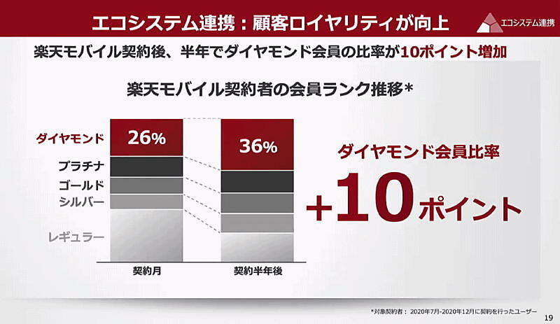 三木谷社長が示した「相性」、つまり顧客ロイヤリティについて、楽天グループが2020年7-12月に契約したユーザーを対象に調べたところ、契約月は26%だったダイヤモンド会員が、半年後には36%に拡大。「モバイルはロイヤリティを深めるサービスだと言える」(三木谷社長)