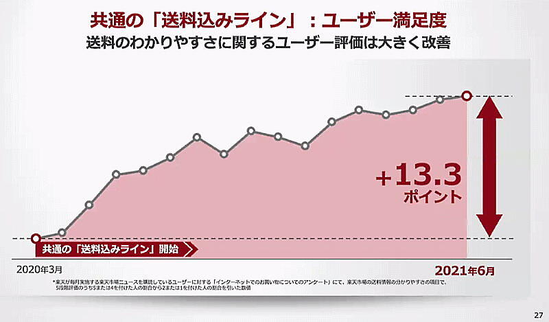 また、「送料込みライン」スタート時と2021年6月で「送料込みライン」ユーザー満足度は13.3ポイント増えている。
