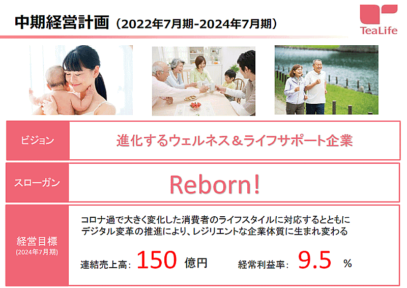 健康茶などの通販事業を手がけるティーライフは、2024年7月期を最終年度とする3か年の中期経営計画(中計)を策定した。中計最終年度の数値目標は、連結売上高150億円、売上高経常利益率は9.5%。