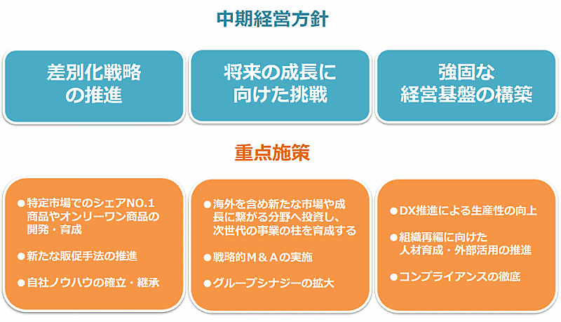 中期経営方針には「差別化戦略の推進」「将来の成長に向けた挑戦」「強固な経営基盤の構築」の3点を掲げた。